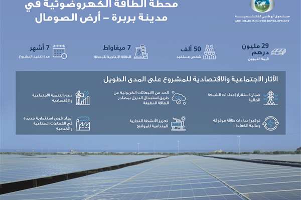 ومول الصندوق المحطة التي تبلغ سعتها الإنتاجية 7 ميغاواط من الطاقة المتجددة بقيمة 29.3 مليون درهم، حيث تم إنجاز كافة أعمال المشروع بوقت قياسي لا يتجاوز سبعة أشهر لتلبية الطلب المتزايد على الكهرباء لسكان مدينة بربرة البالغ تعدادهم حوالي 50 ألف نسمة. كما سيلعب المشروع دوراً هاماً في تعزيز امدادات الطاقة لخدمة التوسع في ميناء بربرة مستقبلاً، إضافةً لتلبية الطلب على الكهرباء الناتج عن إنشاء المصانع الجديدة في البلاد.