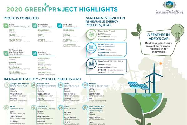 وافق الصندوق خلال عام 2020 وضمن الدورة التمويلية السابعة من المبادرة التي أطلقها في عام 2013 لدعم مشاريع الطاقة المتجددة بقيمة 350 مليون دولار بالتعاون مع آيرينا على تمويل ثمانية مشاريع في كل من نيبال وتشاد، سانت لوسيا، كوبا، بوركينافاسو، سانت فينسنت والغرينادين، المالديف وأنتيغوا وبربودا بقيمة اجمالية تبلغ 384 مليون درهم، ما يعادل (105 ملايين دولار أمريكي)، حيث تنتج المشاريع الثمانية طاقة بسعة 47.8 ميغاواط.