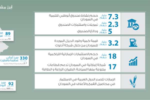 ونتيجة للعلاقات المتميزة التي تربط بين البلدين الشقيقين ارتفع حجم الاستثمارات والتمويلات التنموية الاجمالية التي قدمتها دولة الإمارات للسودان لأكثر من 28 مليار درهم، فيما تعمل 17 شركة إماراتية بقطاعات اقتصادية متنوعة في السودان.