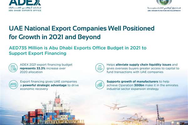 ADEX was established by Abu Dhabi Fund for Development (ADFD) to provide loans and credit guarantees to foreign importers of non-crude sector goods and services from UAE companies, with payment made directly to the UAE national company upon successful delivery on contract terms. In its first full year of operation in 2020, ADEX committed AED500 million ($136 million) against the allocation budget to overseas buyers to meet their procurement needs from UAE exporters.